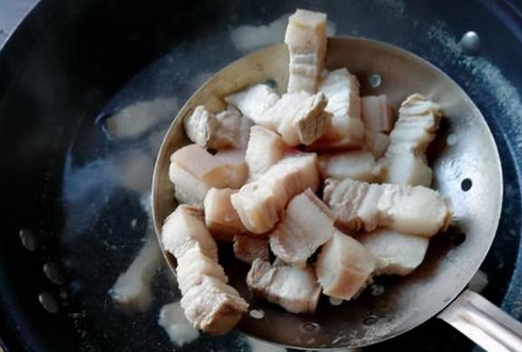 1、首先我们将刚买回来的五花肉冲洗干净,接着切成块状,冷水下锅进行焯水,记住水里要丢几块姜片进去,再添入少许食盐,使其慢慢加热,等到锅里沸腾后,用勺子将表面的浮沫撇去,之后捞出肉块,放入冷水里过凉。