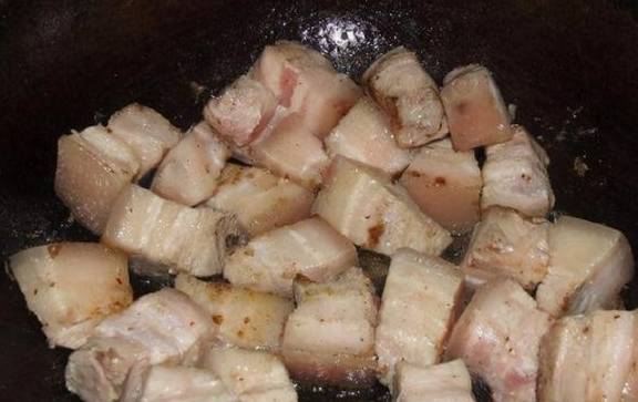 2、架锅添油,等油温升至六成熟时,便将五花肉块倒进锅中,稍微先煸炒一下,控一会儿油,接着将适量的冰糖下入锅中,小火慢炒,直到冰糖完全融化之后,再往锅里添入少许清水,然后大火开始煮制。