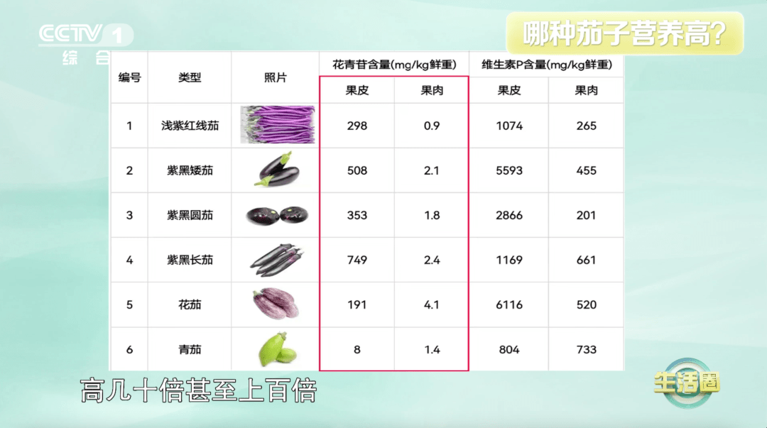 不同类型茄子中,果皮中的花青苷和维生素P含量大于果肉中的花青苷和维生素P含量。其中,茄子皮的花青苷含量要比茄子肉的花青苷含量高几十倍甚至上百倍,而维生素P含量差异比较小。因此可以看出,茄子的营养价值与形状,没有太大关系。