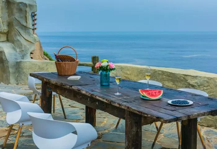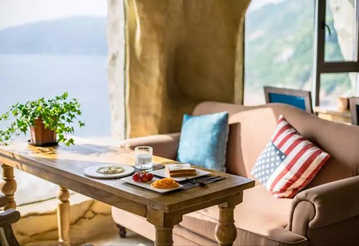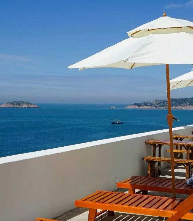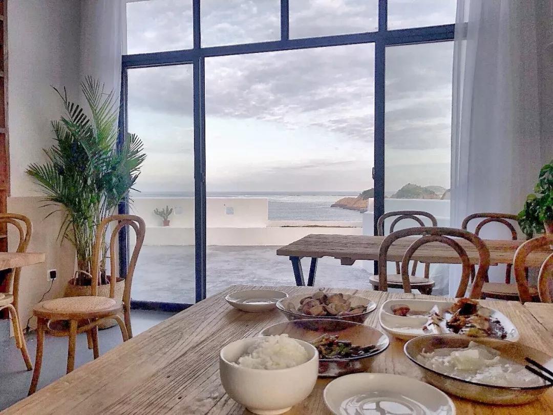 客栈以暖调地中海简约风格为主,白墙绿植,朝南露台坐拥一线海景,只在这里便可望海听浪。同时还有简单精致的菜肴,刚捕捞的海鲜,填饱了胃,幸福感自然滴溢出了整个夏日午后!