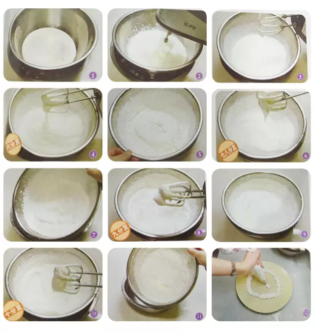 打发过度的的蛋白霜,大量的蛋白会黏在打蛋头上,蛋白内充满粗糙如棉絮般的组织,这样的蛋白霜制作的蛋糕干燥,膨胀度不高。