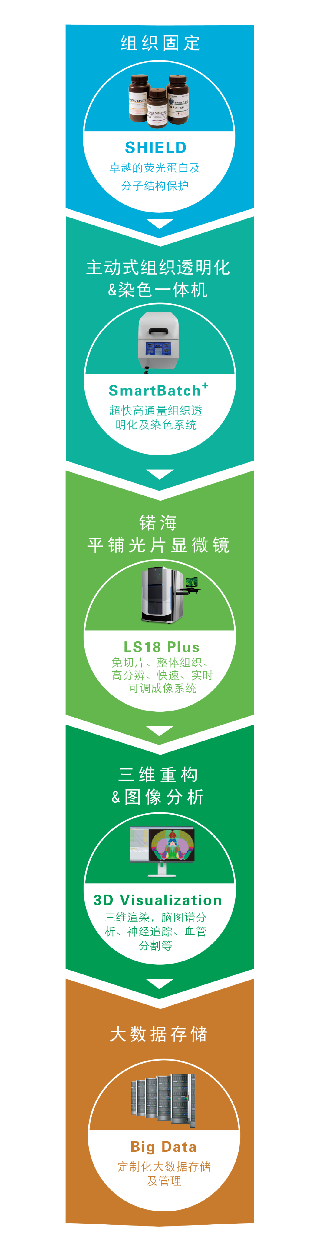 Biotechnol,2018)固定方法与SmartBatch+系统方法高效结合,可在所有的组织处理过程中良好地保护荧光蛋白信号、抗原的分子和物理结构;同时将主动透明化与迭代研发的Clear+透明化系统相结合,可在一天内实现组织光学透明且无任何形变(既不膨胀亦不收缩),Clear+透明化系统也是迄今为止能保留样本原有形态的组织透明化技术;基于专利的eFLASH技术(bioRxiv,2019),有效结合了SWITCH(Cell,2015)和Stochastic