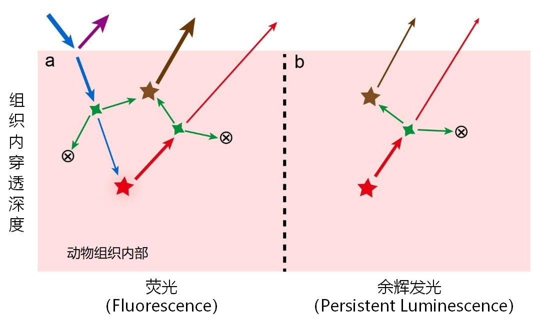传统的荧光(Fluorescence)组织成像,是将成像组织置放于不断发射特定波长的光源照射下进行。受同一个光源照射影响,周围的组织自体同样会产生荧光,称为背景荧光。背景荧光的存在将使得信噪比下降,不利于对目标组织进行成像。因而近几年,科研工作者开始寻求一种新的发光成像——余辉发光(Persistent luminescence)。