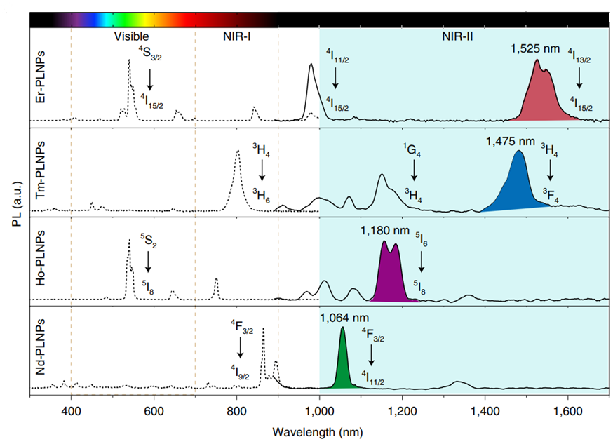 图2 通过掺入不同的稀土元素(Er、Tm、Ho、Nd)调整纳米粒子在NIR-II波长段的发射波长