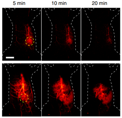 图3 余辉发光纳米粒子(上)与荧光纳米粒子(下)分别在注射后 5、10、20 min 得到的NIR-II成像