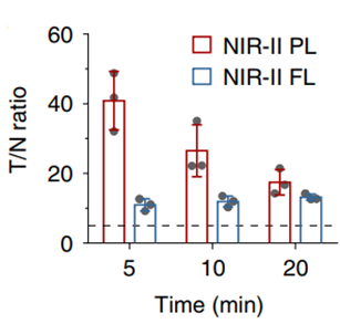 优化后的Er-PLNPs进行了小鼠的腹部血管成像和输尿管成像测试。在腹部血管成像测试中,相对于荧光成像,余辉发光成像获得了更高的肿瘤/正常组织亮度比(T/N