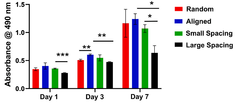 一、体外实验:考察不同打印条件所得支架的细胞增值情况。作者分别打印出随机(Random)、有序(Aligned)、小孔(Small Spacing,250 μm间距)、大孔(Large Spacing,500 μm间距)四种支架结构(图1),在附着细胞并培养1、3、7天后,分别对细胞成活率进行检测。结果为有序(Aligned)打印模式下的支架效果更好(图2)。