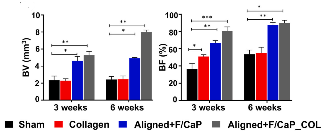 在植入大鼠牙槽后分别于第3、6周检测骨体积(BV)和骨填充比例(BF),发现Aligned+F/CaP_COL的表现更佳(图3)。