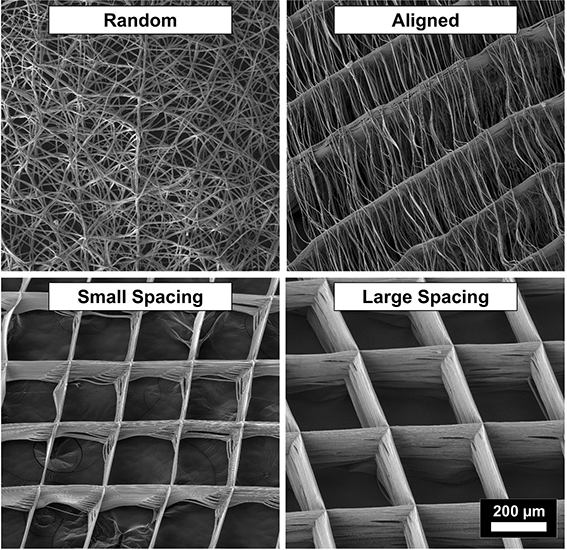 作者使用的主体材料为PCL——一种FDA批准可用于人体的聚合物,可在加热条件下熔融,并可在电场下被拉成极细的纤维,因此可以应用于静电纺丝书写中。使用的设备为放置于生物安全柜中的regenHU生物3D打印机(配备MEW:熔融静电纺丝书写打印头)。将原料颗粒置于料仓中,加热至90并维持30 min后,以一定的气压、电压和速度进行打印。