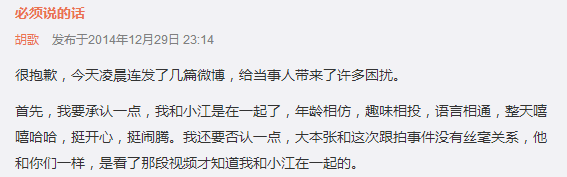 12月29日晚,胡歌在微博再次发出长文,让所有关心他的粉丝大跌眼镜。他不再闪烁其词,直接承认了与江疏影的恋情,同时澄清网络上对于自己与经纪人之间矛盾的猜测。“我要承认一点,我和小江是在一起了,年龄相仿,趣味相投,语言相通,整天嘻嘻哈哈,挺开心,挺闹腾。我还要否认一点,大本张和这次跟拍事件没有丝毫关系,他和你们一样,是看了那段视频才知道我和小江在一起的。”https://mmbiz.qlogo.cn/mmbiz/jane9Rjrf7Kb9BRofPqWdWcCBGkiaW57RQdmIiamHNibNJOalGu3HbqhGSRN0sQoEjibSVwR2bLrFSzlKnA0BJbIyQ/0剧情大逆转!胡歌江疏影公开恋情" TITLE="起底|