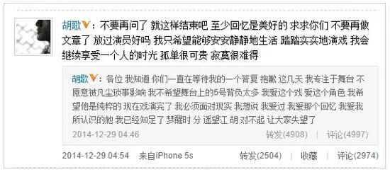 12月29日凌晨,胡歌连发四条微博回应与江疏影绯闻,称“我想说,我爱过,我爱那个回忆,我爱我所认识的她,我已经知足了,梦醒时分,遥望江胡,对不起,让大家失望了。”疑承认与江疏影恋情,但现在已分手。并请粉丝不要再追问,只希望能够安安静静地生活,踏踏实实地演戏,“我会继续享受一个人的时光,孤单很可贵,寂寞很难得”。