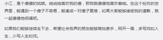 胡歌的长文中还提及了与江疏影的恋情状态,不同于之前微博中的疑似分手,胡歌文中透露出仍与江疏影处于恋爱关系中,并希望获得大家的祝福。“小江,是个傻傻的姑娘。她说她喜欢我的傻,那我就傻傻地喜欢着她。在这个纷扰的世界里,能遇到一个傻子不容易,能凑成一对傻子更难,如果大家能够接受我的道歉,就一起傻傻地祝福吧。如果我们能够继续走下去,希望社会各界的朋友能够高抬贵手,网开一面,多写戏如人生,少写人生如戏。”