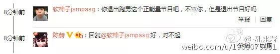 PS.记得在陈赫离婚刚被踢爆的时候,有个女生回复陈赫让他退出跑男这个正能量的节目。好死不死地,陈赫回了一句“好,对不起”。
