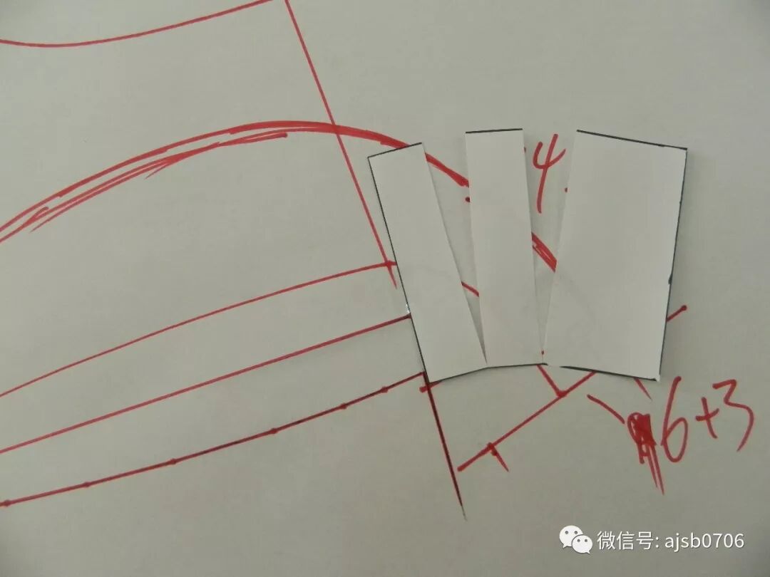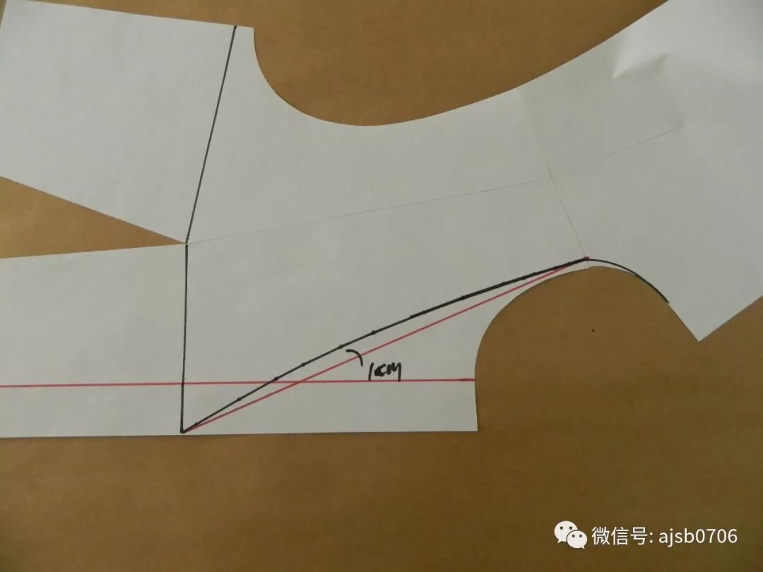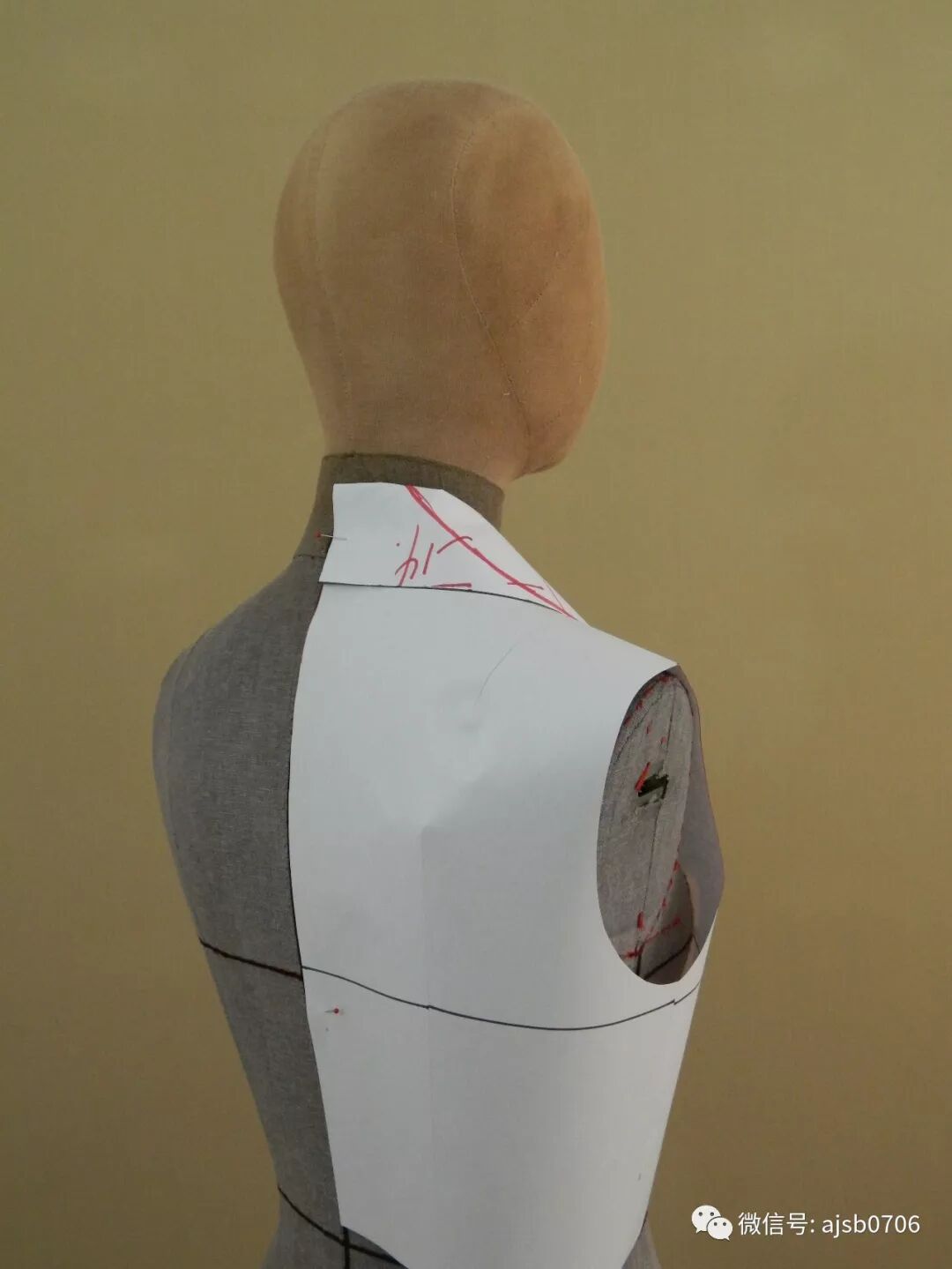 做一个长方形,长度等于后领口弧长,宽度等于后翻领高度。在长方形1/2和1/4处剪开。长方形剪开的一边展开,使其长度等于后片领外口弧线长。把展开的长方形一端搭在复制后的肩颈点上,再把长方形另一个端点搭在原肩线上。复制展开后的长方形。使领外口后中至前肩的长度等于后片领外口弧线长。