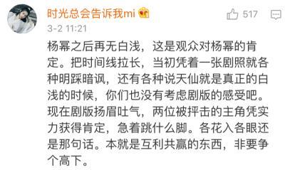 面对刘亦菲粉丝的不满,杨幂粉丝这边也有话说:当初凭着一张剧照就说“天仙”是真正的白浅时,有没有考虑剧版感受?现在两位主角扬眉吐气了,急跳什么脚?
