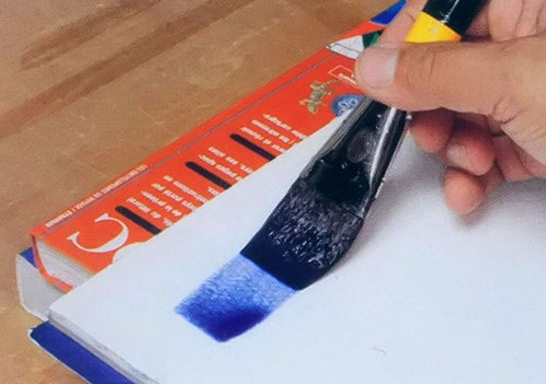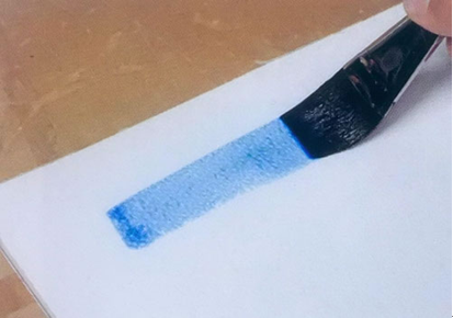 想象着颜料从笔落到纸上时移动轨迹’慢慢运笔。为了不改变颜料的浓度,用力均匀稳定行笔。以相同的速度稳定行笔。在平放的纸面上着色后,颜料会从水分多的区域流到水分少的位置。干燥后,画纸吸水的部分会变形鼓出来。着色面积越大,纸的起伏越严重,干燥时甚至会形成斑痕。