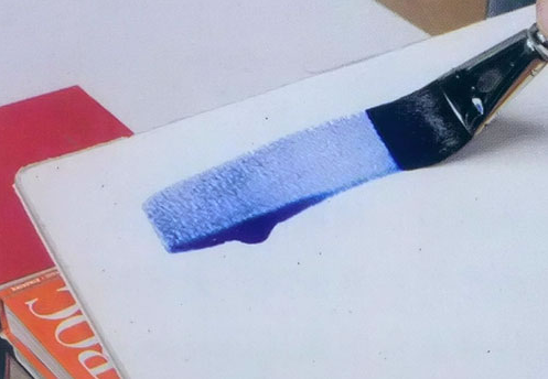 加大倾斜度后,涂覆与倾斜15度时相同量的颜料。快速带动颜料,下面积留了颜料。涂色时不能来回运笔,沿着一个方向涂色。快速带动颜料后,下面积存了颜料。干燥后,这是颜料流动后的状态。如果使用画架等支撑立起来作画,那么水分不要太多,尽量提高颜料的浓度。作画时要避免颜料流淌。