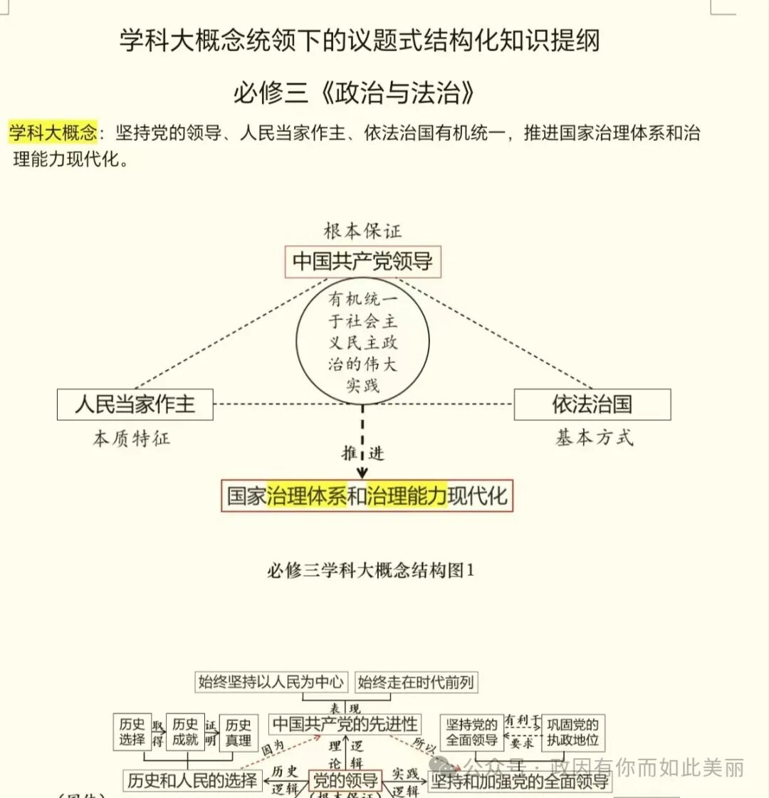 该提纲以学科大概念为统领,将学科概念按照学科大概念、核心概念、关键概念和具体概念的层级进行层次化、结构化梳理,绘制概念地图,厘清学科理论逻辑,弥补学生的知识短板,打通知识融通的堵点;以议题为主线,将学科知识实行议题化设计,议题设计遵循学科知识的内在逻辑,将问法新颖、灵活多变并具有内在一致性的高质量议题进行深度融合,挖掘并寻找不同议题间的内在一致性,总共融通了必修三中的156个重大议题,在议题总结中整合建构学科单元知识,掌握学科大概念,建立起可复制、可迁移、高通路的知识结构。