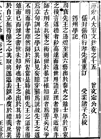 唐宋八大家是中国古代选本文化的产物,选本作为文学批评的一种独特方式,体现了编选者的文学思想。上图是明代茅坤编写《唐宋八大家文钞》书影,茅坤不仅对每篇文章都有评点,而且对八大家的文章分别有一个总评,这一体例也为清朝张伯行采用。下图是张伯行编写《唐宋八大家文钞》书影,这一页展示的是曾巩的文章,张伯行对曾巩尤其推崇,这是与茅坤版本不同之处。