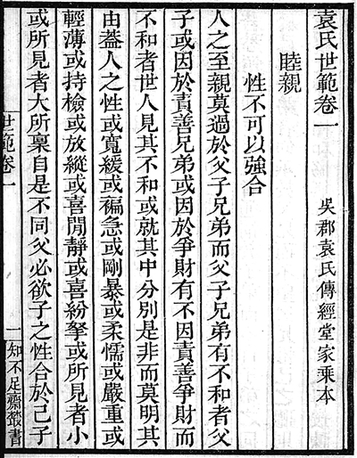 《袁氏世范》共三卷,第一卷是《睦亲》,论及父子、兄弟、夫妇、妯娌、子侄等各种家庭关系的处理,具体分析了家人不和的原因、弊害,阐明了家人如何和睦相处的各种准则。