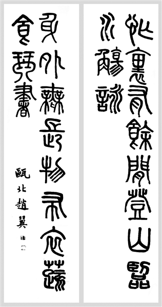 图:清乾隆二十六年(1761年)探花、史学家、文学家赵翼篆书对联“忙里有余闲,登山临水觞咏;身外无长物,布衣蔬食琴书”。 罗慕赫 摄