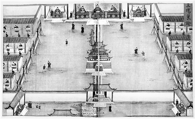 图:明朝科举考试考场图,考生在小小的号舍中答卷,每间号舍都有专人监考以防舞弊。