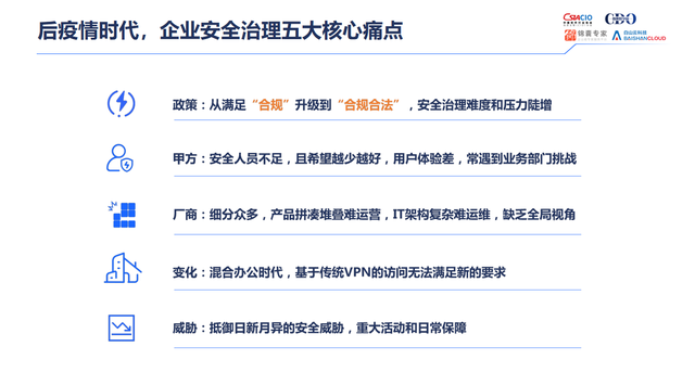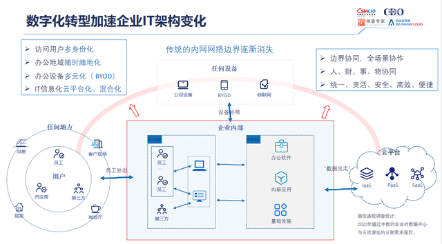 在数字化时代背景下,企业数字化转型可能会面临的三大挑战和五大痛点。从访问地点上来说,随着数字化转型的加速。通过新兴技术实现企业员工访问数据中心,不再局限于企业内部。从访问身份上来说,来访者的身份可以是合作伙伴、外包人员乃至整个生态里各式各样不同的身份,不再仅限于内部员工。从访问设备上来说,从企业原有的单一设备,向企业设备、移动设备、物联网设备等多元化办公设备转变。