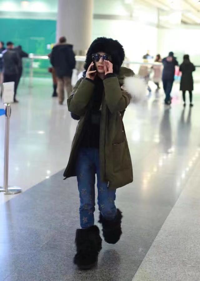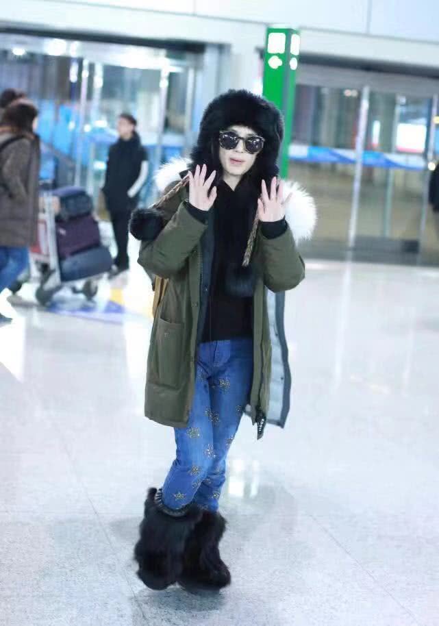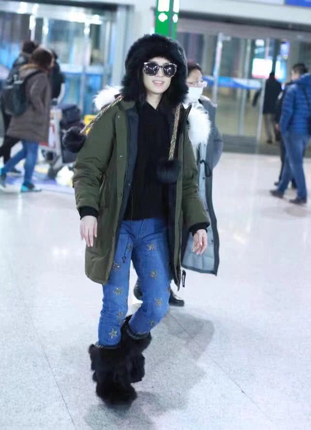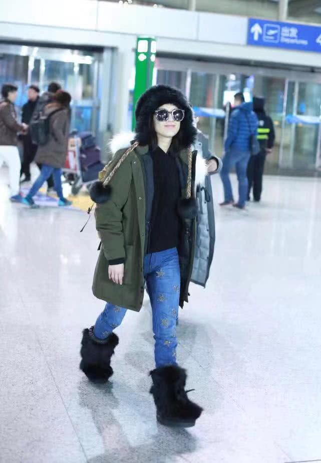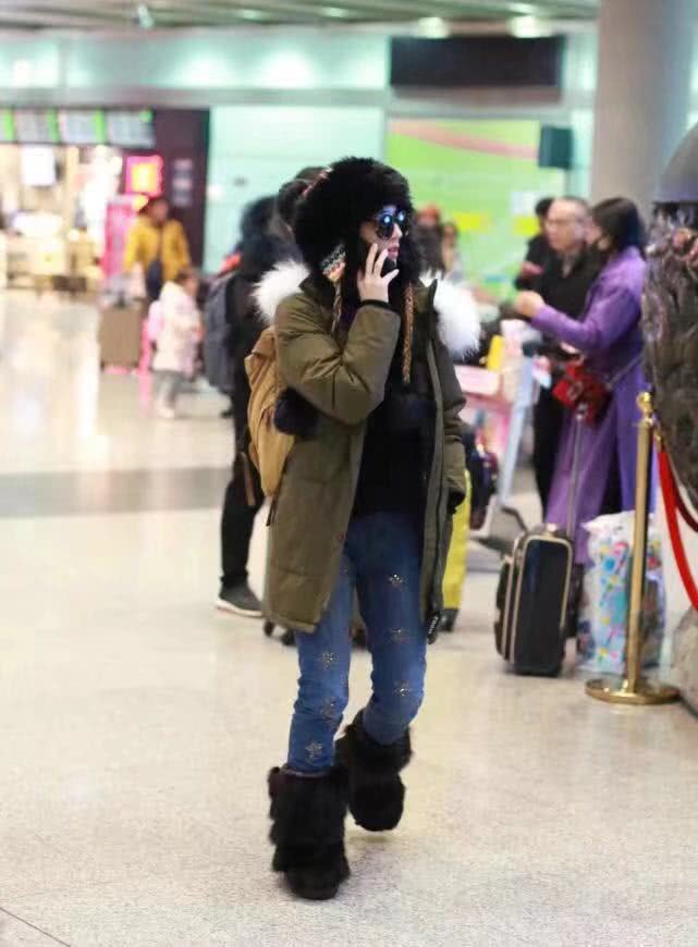 黄圣依保暖冬装走机场,牛仔裤塞进毛绒靴,网友:换上鞋可好?