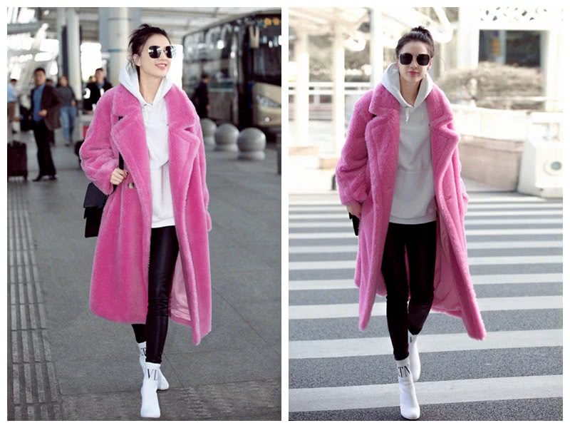 比如这一身,卫衣与毛绒大衣叠穿,同样也是选择的毛绒单品,但是这一身显高、显瘦又显气质。那是因为黄圣依穿着紧身皮裤搭配高跟短靴,拉长了整个人的身材,显得气质特别好。