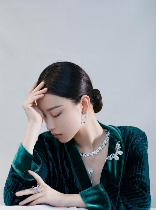 优雅迷人的贵妇范,在衣品穿搭上倪妮还真不是属于那种有忌讳的风格,什么样的凹造型都能完美hold住,一头盘扎的民国复古发型,墨绿色的金丝绒造型显得很大气,尤其是各种小饰品的装饰,看上去一下子变得很有贵族的气息,非常养眼。