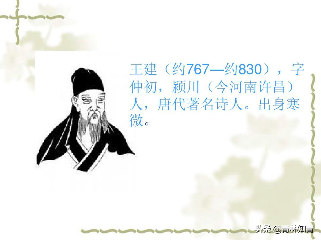 王建大约出生在767年,出身寒微,一生潦倒,他的仕途现在是没人能说得清楚,有资料说他是大历进士,但这个一看就是乱说,大历是唐代宗李豫的年号,从766年启用,前后14年,满打满算,一个13岁的少年是不可能中进士的。