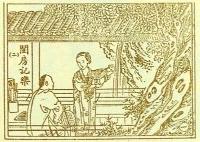 甫一进洞房,“遂与比肩调笑,恍同密友重逢。戏探其怀,亦怦怦作跳,因俯其耳曰:‘姊何心舂乃尔耶?’芸回眸微笑,便觉一缕情丝摇人魂魄,拥之入帐,不觉东方之既白。”