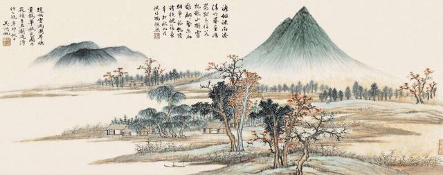《鹊华秋色图》是中国书画史上有一幅名作,图上所绘乃济南景致,鹊山起势崔巍,华山绿秀如芙蓉,平川洲渚,红树芦荻,渔舟出没,远树茅屋,虚实相生,笔法潇洒,现存台湾故宫博物院。