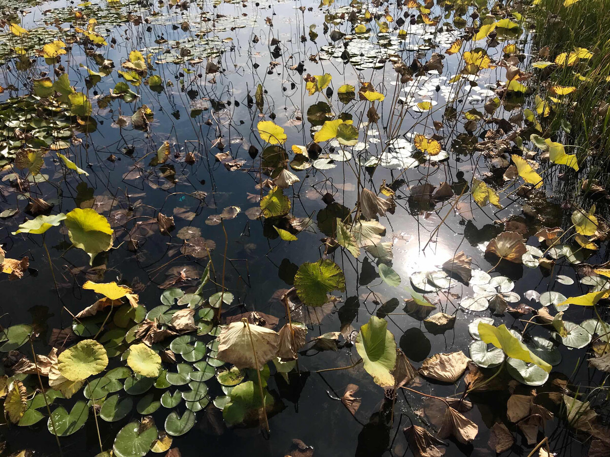 残荷夕阳,原本都是隐喻伤感的物象,荷叶如笠,如伞盖般托着金色的夕阳,鱼儿欢快地流动水中,在枯荷的枝杆中穿梭,如一幅《荷塘夕照图》的写意画,于是,便又引出了诗人理想化的诗兴。