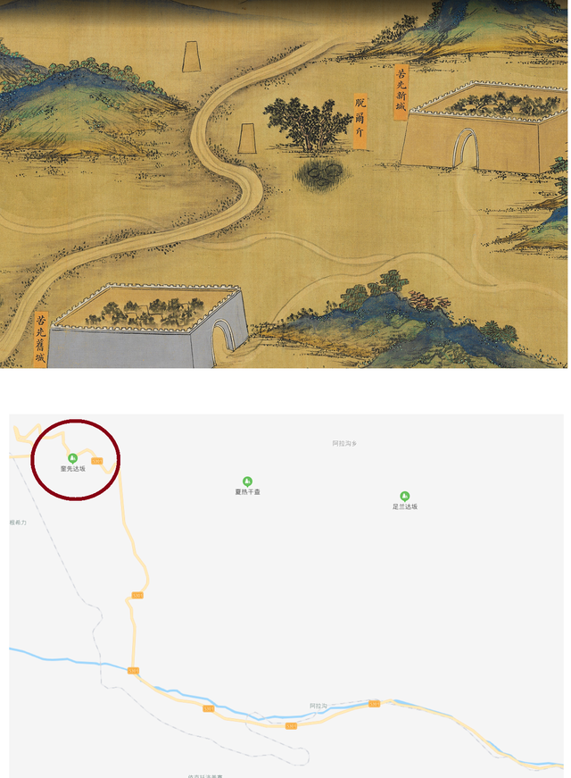 《丝路山水地图》脱辛应指今托克逊,“苦先新城/苦先旧城”应指今奎先达坂附近,从托克逊开始,《丝路山水地图》绘制的是南疆路线,则亚历山大大帝攻打的撒马尔罕应在今焉耆盆地。亚历山大大帝最后驻跸之地巴克特里亚(Bactria)应为今新疆巴楚县(巴克楚尔)。