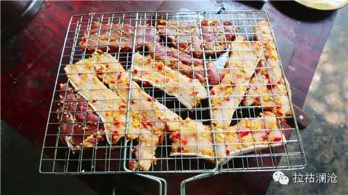 少数民族都有烤肉的习惯,若说烤肉食材与火源的原生古朴及其美味,拉祜烤肉当位列前茅。拉祜烤肉用的是放养在大山里每天跑着“马拉松”的猪,火源用的是森林里出来的杂木或栗炭,把腌制好的肉放在火塘架上烧烤,喷香扑鼻,诱人馋涎。