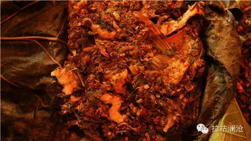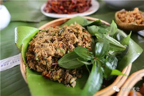新鲜的活鱼,割出鱼肉后,用热水焯一下,将焯过水的鱼肉,剁细成泥状放入舂桶中,加上十多种佐料后捣碎便可食用了。