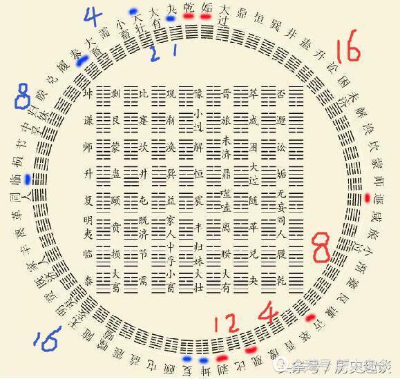 对比这两个图,可以看出,金批本卦序大致是按京房卦序来排序的。但又不尽完全相同。