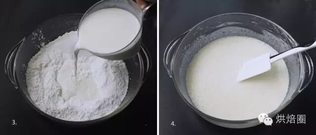3.分次少量的加入牛奶,仔细搅拌至完全没有颗粒的糊状,最后再加入玉米油拌成稀面糊。(牛奶倒入面粉的过程中,最好是分次进行。这样就不会有结块的现象。玉米油要提前量称好再倒,这样可以防止一下子倒过头无法挽回。)