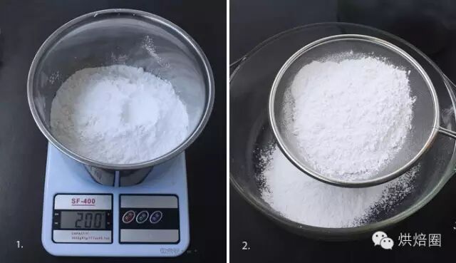 2.将所有粉类混合过筛到大碗中。加入糖拌匀。