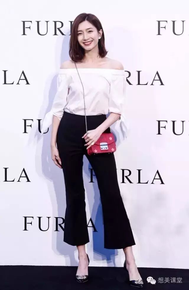 ▲一字领白色露肩衫结合高腰剪裁黑色阔腿裤,轻松搭配出了清爽干练的视觉效果,完美打造都市典雅别致的时髦女郎形象,将极简主义诠释至极。