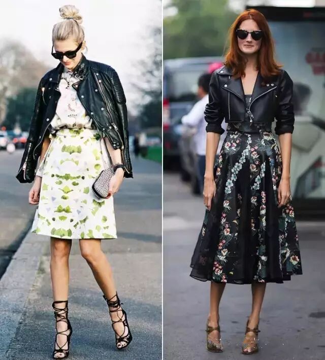 机车皮衣搭配各种女人味十足的裙子和鞋子,优雅度绝对up,up,up!夏天要穿得裙子也别压箱底了,试试拿来搭配机车皮衣吧。