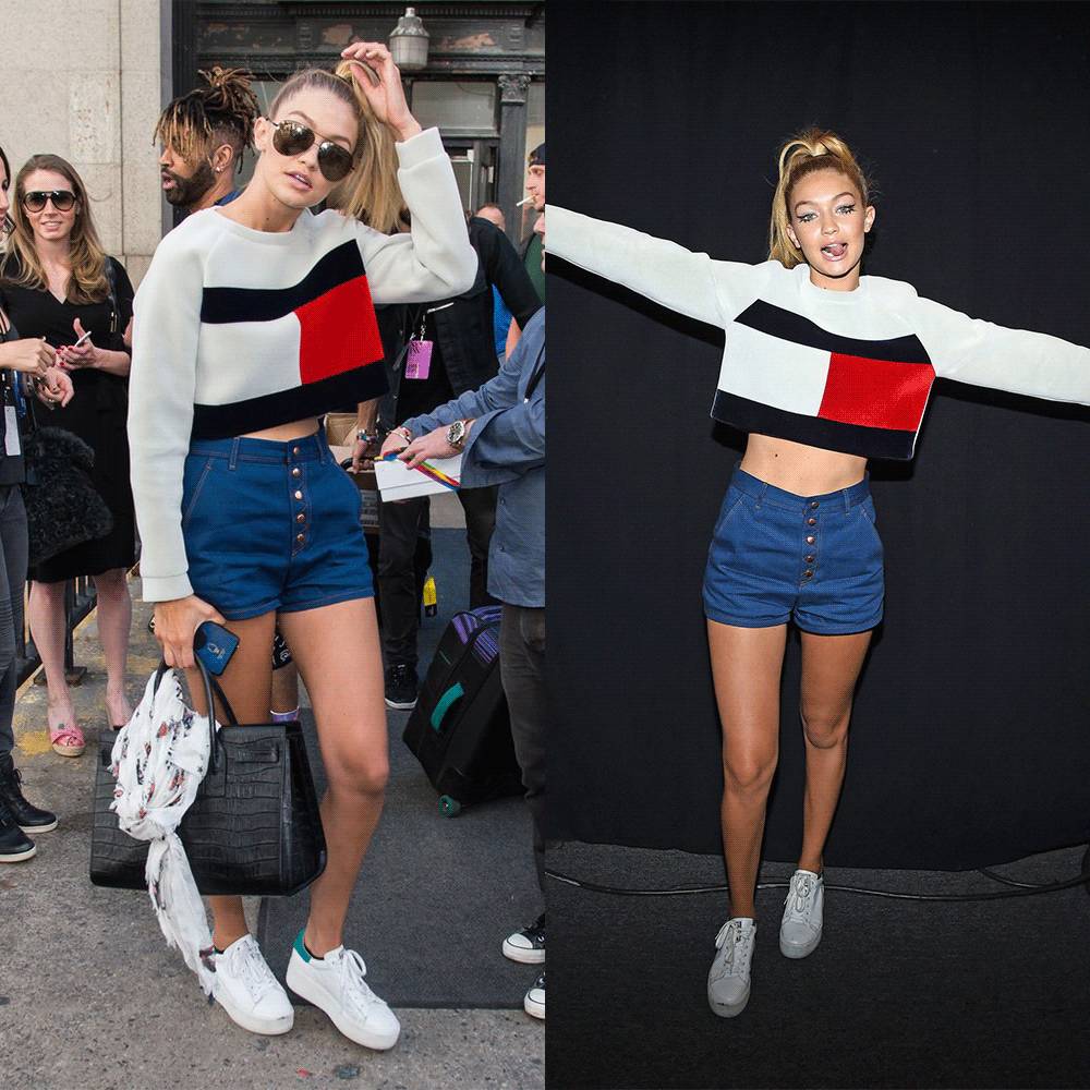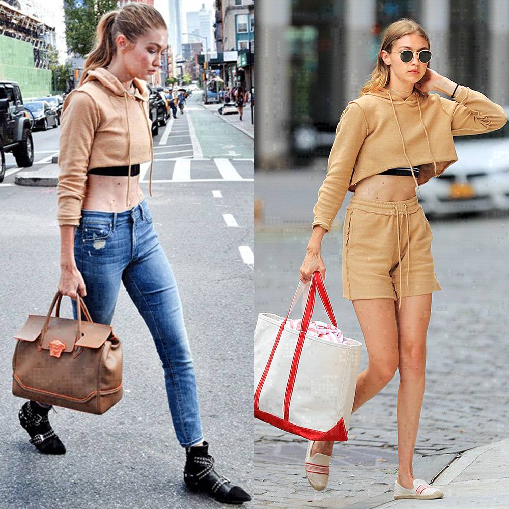肚子小肉肉比较多的话,像Gigi这样,心机的用高腰单品把肉都藏起来,再透出一些腰上皮肤协调比例,假装瘦子一招管用~
