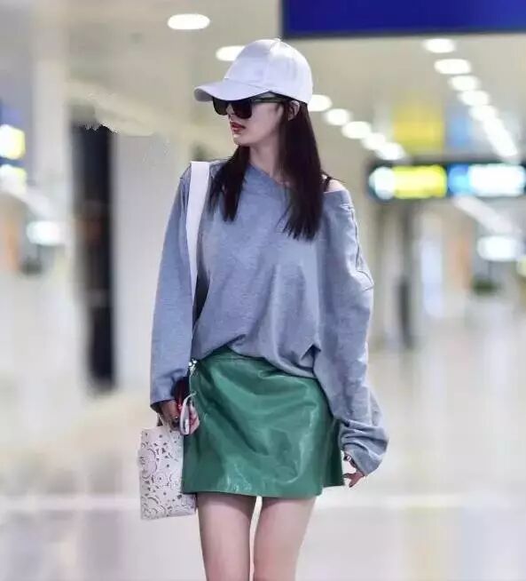 搭配绿色短裙和灰上衣,清爽又精神!