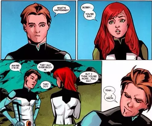 “冰人”鲍比是《X战警》系列颇受欢迎的变种人,也是最早的变种人之一,1963年就出现在漫画中了,他能够将水和空气中的水蒸气冻结成冰,也是潜在的欧米茄级别变种人。在漫画“All New X-Men”中,青少年时期的鲍比对琴-格雷(凤凰女)说自己也许是双性恋,而会读心术的琴则表示,“我觉得你是纯gay。”鲍比并未感到意外,平静的回答道:“好吧,我知道了。”