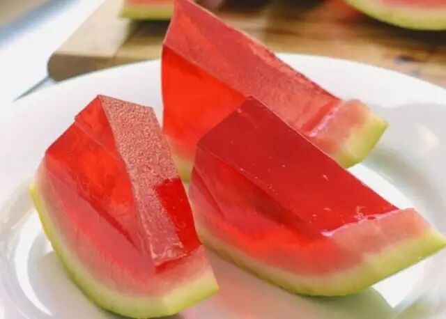 西瓜肉用勺子取出,适当留一点红色瓜肉。琼脂用冷水泡开,取出备用。将取出的瓜肉用料理机打成汁,并用纱布或细网漏勺将纤维滤出,将琼脂和西瓜汁混合后,加热至完全融化,可适量加入白糖。放凉后,倒回空西瓜皮,放入冰箱凝固后切块即可。切块食用。