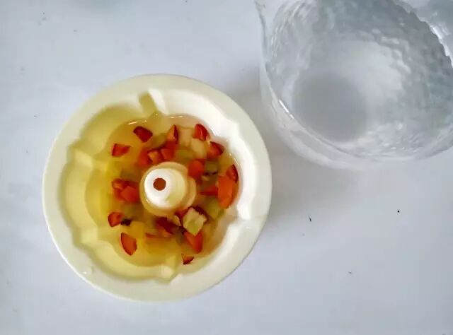 第四步:将25克白凉粉粉用300毫升开水冲开,倒入铺好水果丁的模具三分之一的位置。