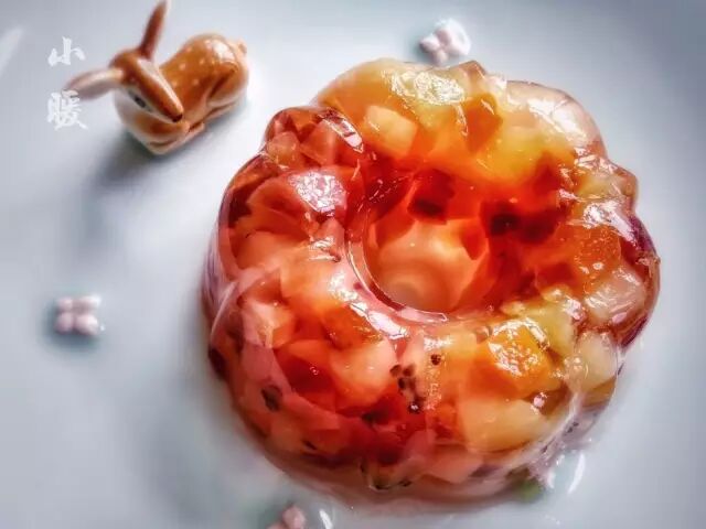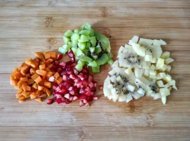 其实这到五彩缤纷水果冻的基本原型来自于四川传统小吃冰粉,冰粉在四川是夏日的解暑良品。冰镇后的冰粉,加入少量的西瓜、少许葡萄干、山楂片,浇上一勺红糖水,在炎炎夏日吃上一碗真是暑气尽消。而我直接将水果丁加入白凉粉中凝结成冻,这样无需再添加糖。白凉粉的原材料是魔芋粉提取物和少许葡萄糖,魔芋粉具有超强的吸水膨胀性,食用后也能有一定的饱腹感。所以除了儿童可以食用,成年人也可以制作这道甜品,作为减脂期间的健康小零食食用。