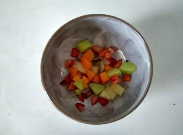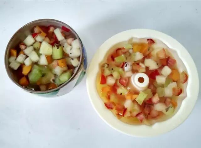 第三步:讲切好的水果定按颜色划分交错平铺在硅胶模具里面(尽量各种颜色交错,做出来比较好看)。如果没有硅胶模,可以用茶碗,将水果丁放入茶碗底部。(没有茶碗,就用您家的碗了)