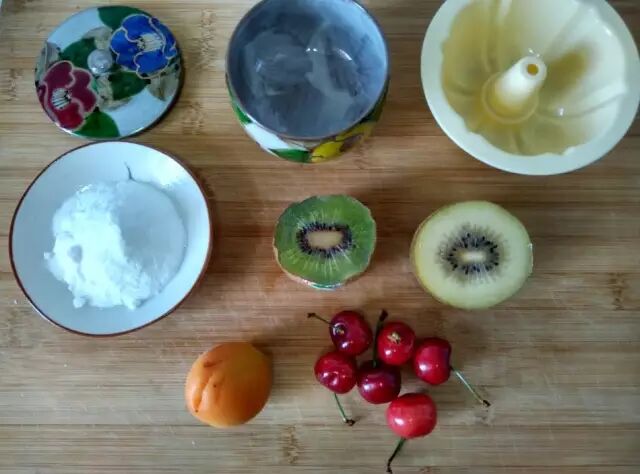 准备食材:红樱桃6个、绿色奇异果半个、金果(黄色猕猴桃)半个、麦黄杏1个、白凉粉粉25克、茶碗1个、硅胶模1个